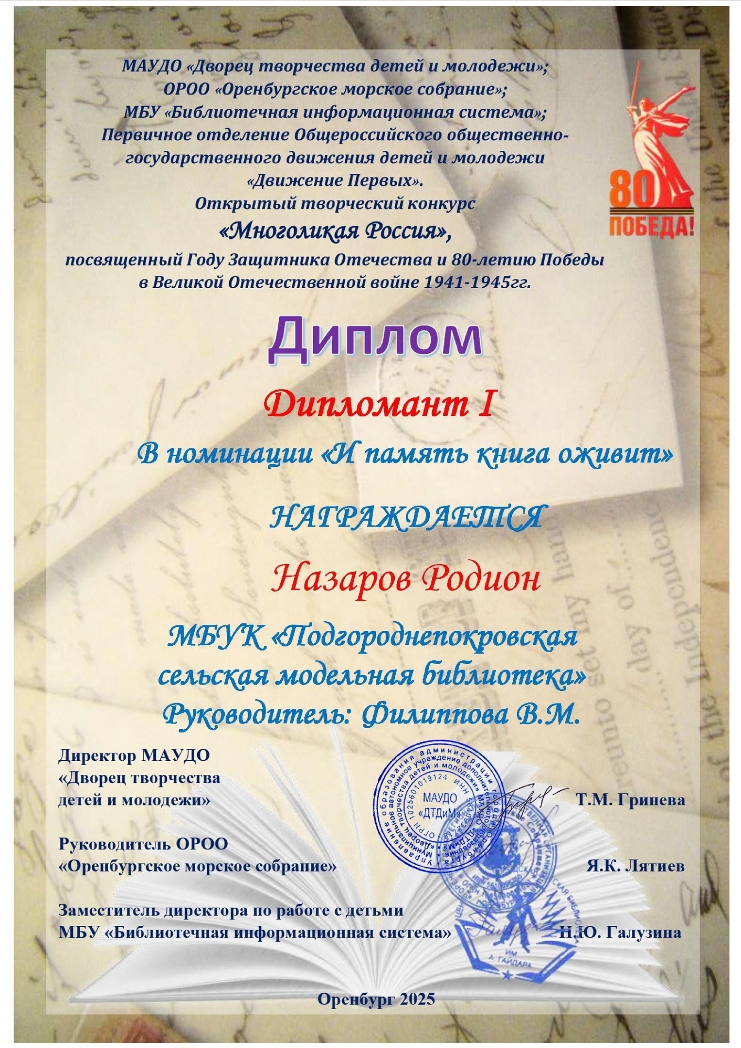 Поздравляем НАЗАРОВА РОДИОНА участника областного открытого творческого конкурса "Многоликая Россия", посвященного Году Защитника Отечества и 80-летию Победы в Великой Отечественной войне 1941-1945 годов.