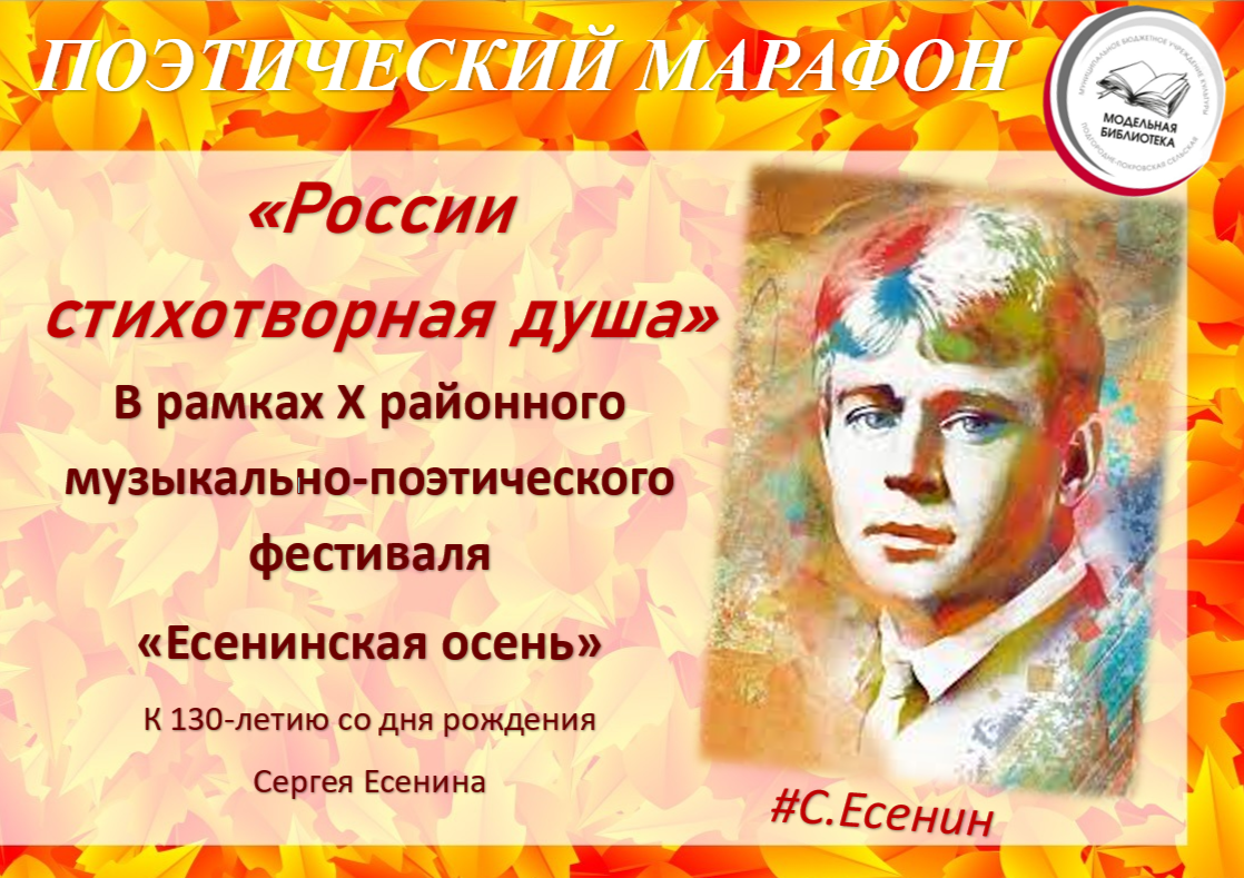 МБУК "П-Покровская сельская модельная библиотека, приглашает вас стать участником поэтического марафона "РОССИИ СТИХОТВОРНАЯ ДУША" в рамках X районного музыкально-поэтического фестиваля "Есенинская осень" и 130-летия со дня рождения Сергея Есенина.