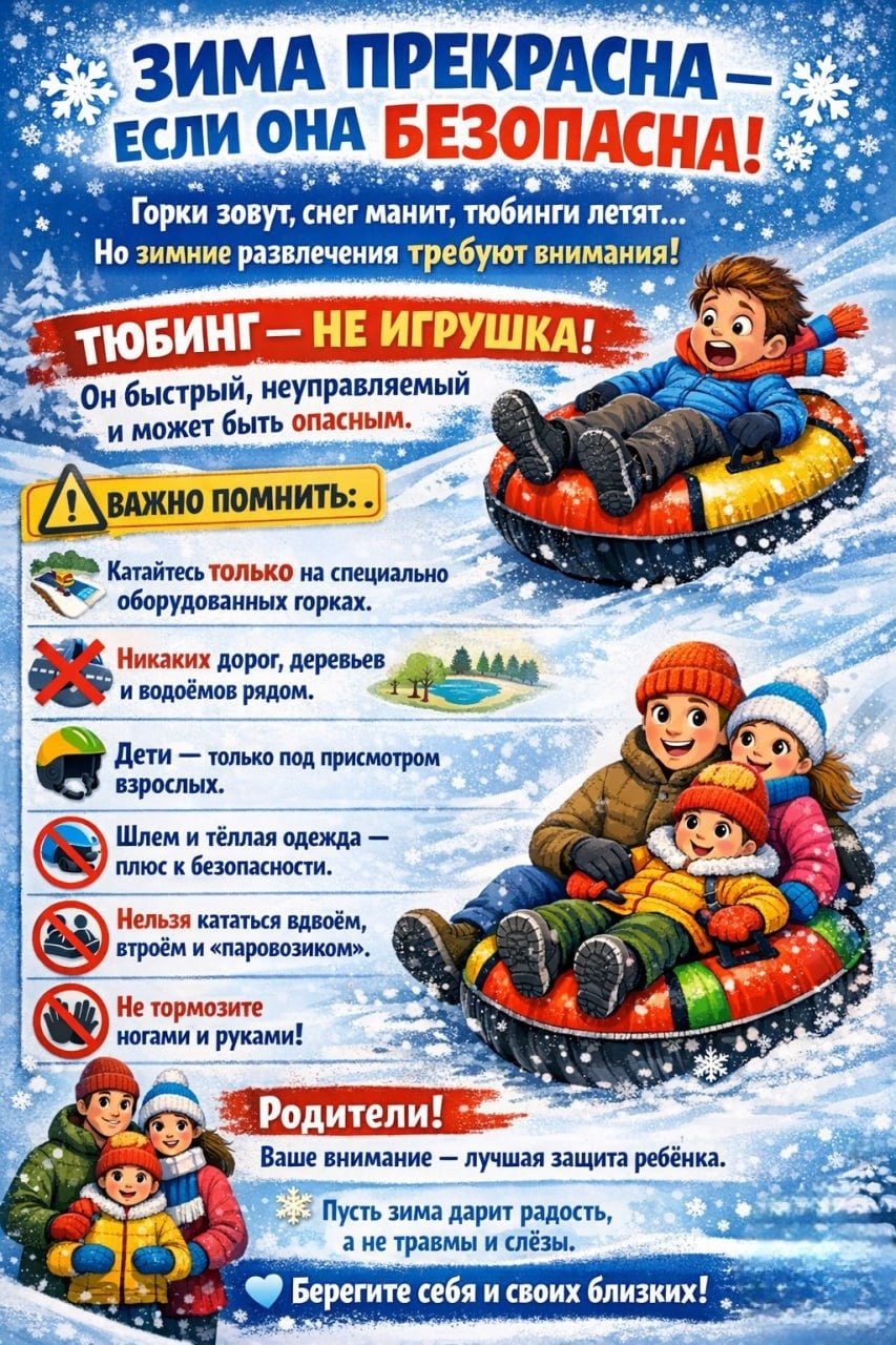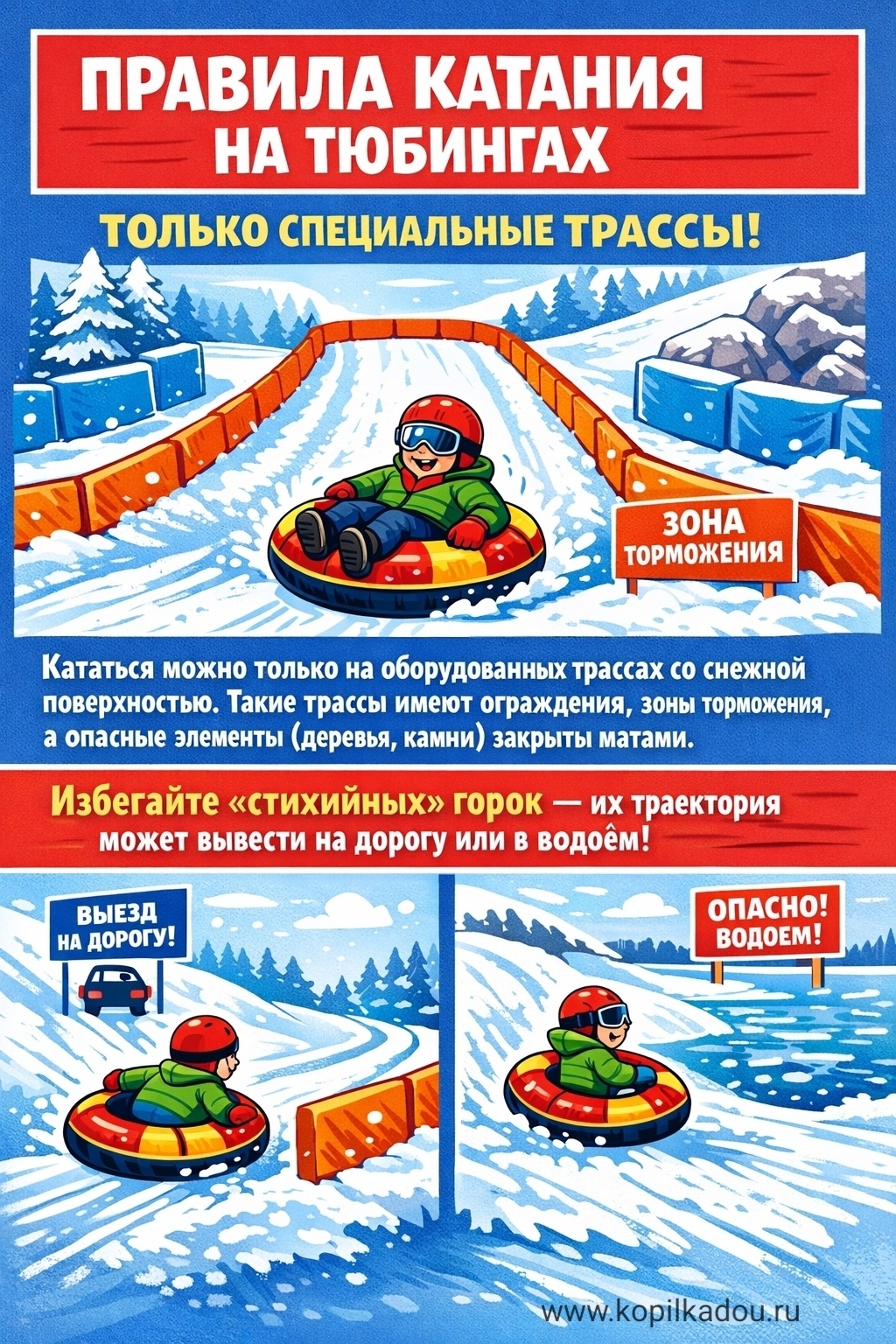 Катание на ватрушках (тюбингах) — экстремальный вид отдыха, опасный из-за высокой скорости, неуправляемости и способности подпрыгивать на кочках.