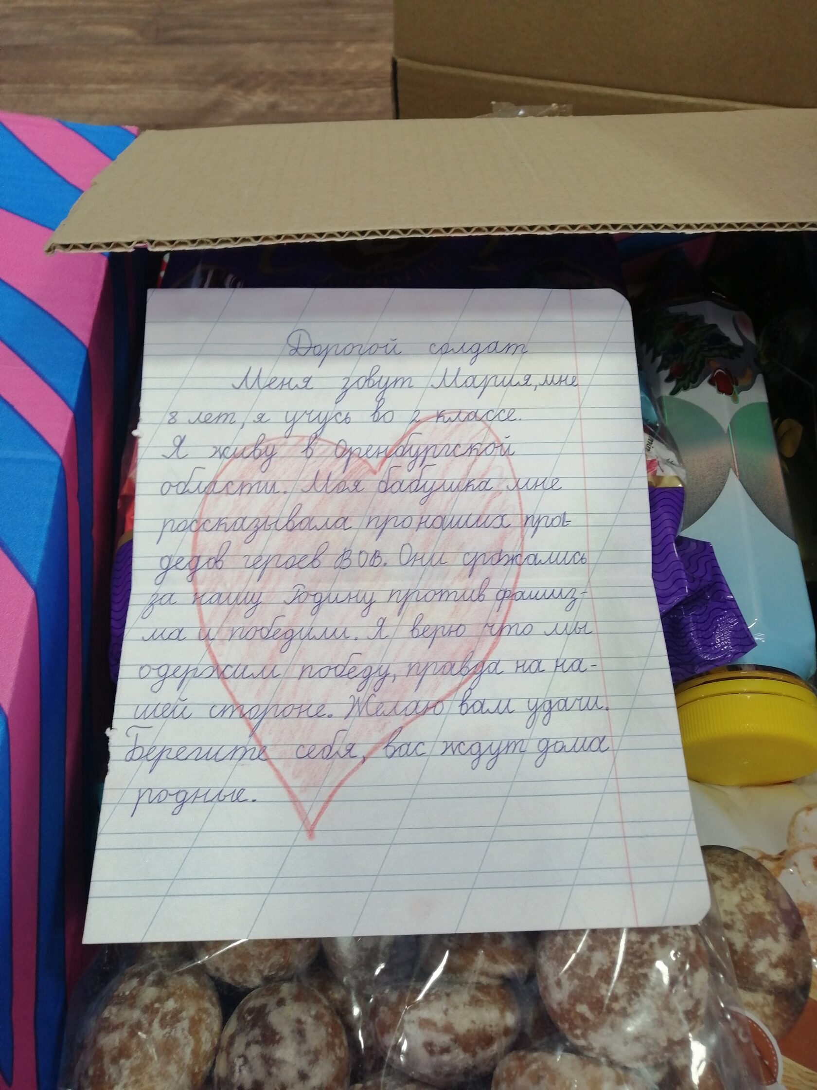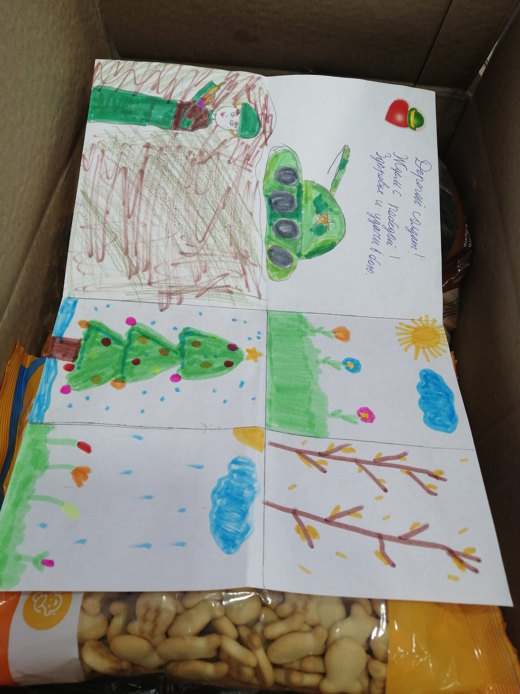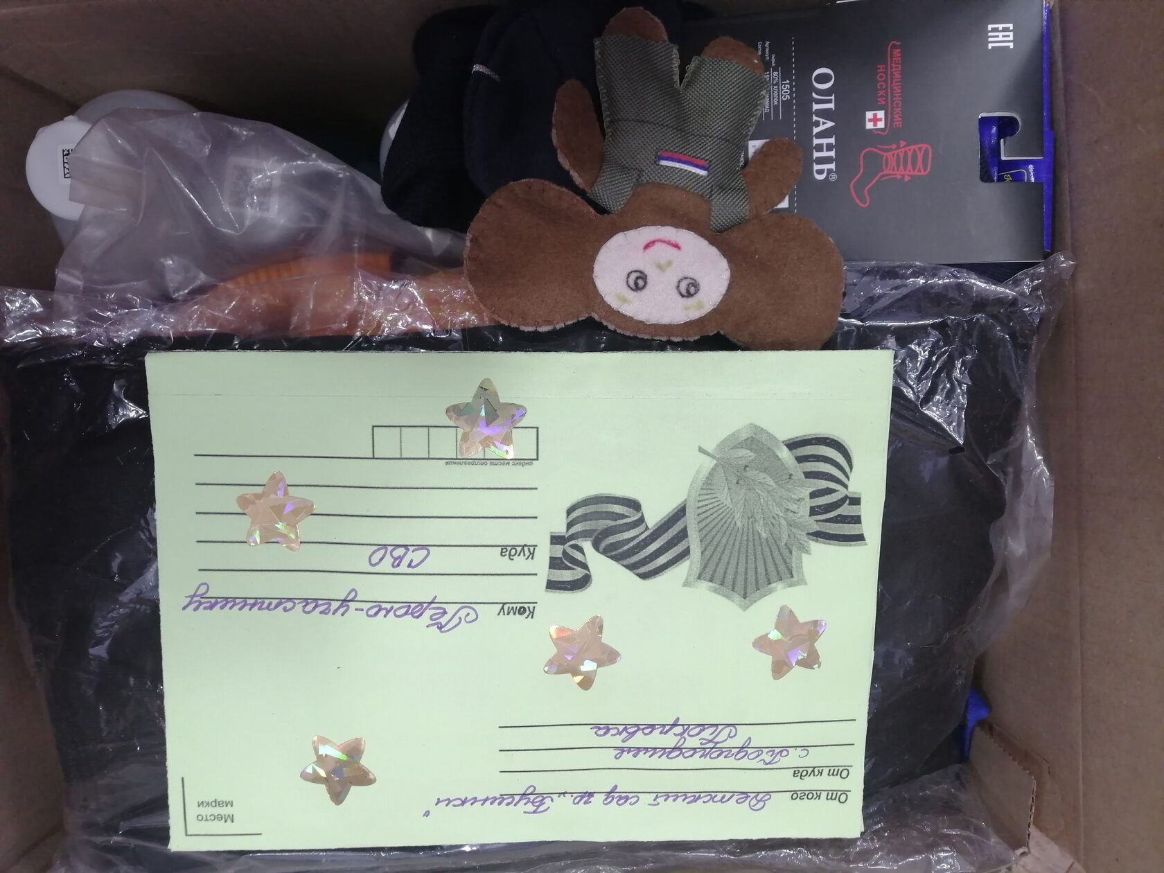 В каждую коробку были вложены средства гигиены, теплые вещи, полевой душ, письма от детей, окопные свечи, продукты питания и другое необходимое в полевых условиях.